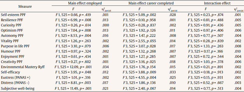 The second goal of this research is to detect differences in resources, subjective well-being, PPF, distress, and eustress, between employed and unemployed individuals. We find that unemployed graduates score significantly lower in resilience, optimism, autonomy, environmental mastery, self-efficacy, and global life satisfaction (subjective well-being), and show higher values of distress compared to those holding a job in accordance with their training. These results match those obtained in previous studies (Creed & Bartrum, 2008; Eden & Aviram, 1993; McKee-Ryan et al., 2005; McKee-Ryan & Kinicki, 2002; Paul & Moser, 2009; Vinokur et al., 2000; Wiener et al., 1999). The result is consistent with the COR theory, which states that the lack of resources gained after the investment of resources for this precise purpose brings about more loss of resources and distress (Hobfoll, 1989).