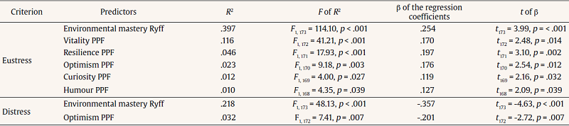 Therefore, in the case of eustress, as in environmental mastery, vitality, and resilience, it seems that it fundamentally predicted individual differences among unemployed graduated in a positive manner, while distress is negatively predicted primarily by environmental mastery and optimism.