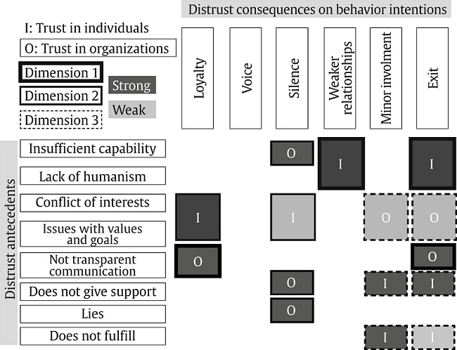 The major findings in this study show firstly a broader map of distrust antecedents than has been reported in the trust/distrust literature; secondly, a rich picture of behavioral intent consequences; thirdly, a meaningful structure; and finally, significant frequency differences depending on the referent.