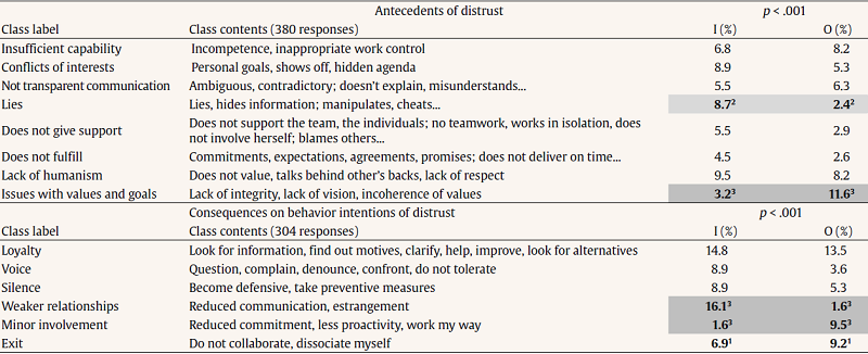 The biggest class in this study, Lack of Humanism, is somehow different from the opposite of Benevolence as it includes Does Not Value (employees contributions, opinions/ideas…). This subclass matches negatively with Perceived Organizational Support, a strong predictor of trust in leaders according to Dirks and Ferrin’s (2002) meta-analysis of leadership trust antecedents. On the other hand and related to Issues with Values and Goals, Chalutz Ben-Gal, Tzafrir, and Dolan (2015) have found empirically that high levels of fit in values within an organization result in high levels of trusting actions, while Edwards and Cable (2009) have explained the processes by which value congruence relates to job satisfaction, organizational identification, and intent to stay in the organization.