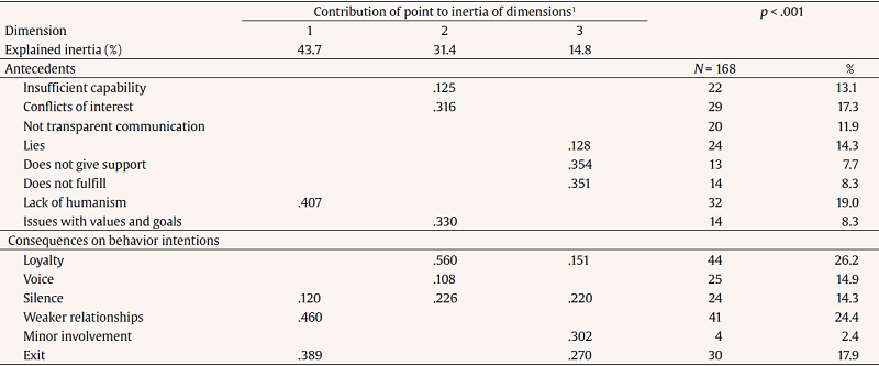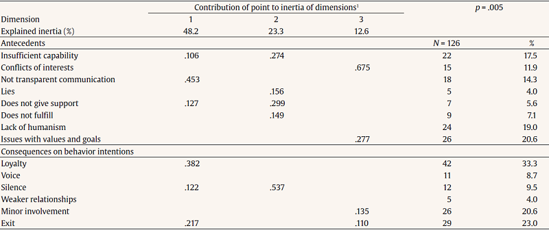 Two dimensions appear to account for around 70% of the inertia (percentage of variance explained by the dimensions). The contribution of points to the inertia of the dimensions is the proportion of inertia of a particular dimension explained by the antecedent or consequence class and indicates how much the class contributes to the dimension; these numbers are similar to factor loadings in factor analysis. For instance, the first dimension of distrust in individuals is explained by Lack of Humanism as antecedent with a factor loading of .407 and is linked to Weaker Relationships and Exit as consequences with factor loadings of .460 and .389, respectively. The horizontal correspondence contributions of each antecedent or consequence to the dimensions are not spread among dimensions, i.e., dimensions are uncoupled. Finally, if antecedent and consequence pairs obtained in second part of round by the six additional participants are excluded (14% responses) results are very similar.
