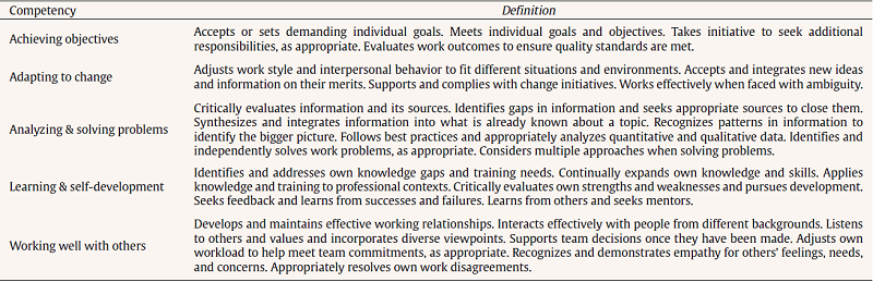 In this study, we focus on five core competencies that were identified in the global validation study as most important and critical for successful job performance of new professionals across geographical regions, industries, and jobs. These core competencies are achieving objectives, adapting to change, analyzing and solving problems, learning and self-development, and working well with others. The definitions of these competencies are provided in the Appendix.