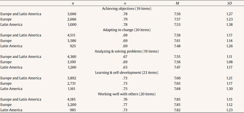 To assure that only valid data were analyzed, we removed data for several reasons. In a limited number of 24 cases, students started the same bundle twice. To exclude biases due to retest effects regarding the same competencies or scenarios, we excluded responses from the second bundle completion. For the same reason, we removed responses of eight students from the second access to any SJT of the same competency. Given that we were interested in cross-regional comparisons, we took care that participants understood the test items well. Hence, we removed data for 87 students that indicated to be“not comfortable” with the language in which they completed the SJTs. Further, we removed students’ responses per scenario if they were made in less than twelve seconds (internal test runs had shown it was impossible to choose both a best and worst response per scenario in less than twelve seconds). Remaining sample sizes for our five core competencies did not justify analyses for the geographical regions of Africa, Asia, Oceania, or the US. Therefore, we focused our analyses on students from Europe and Latin America.