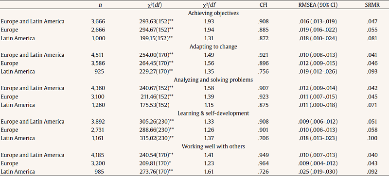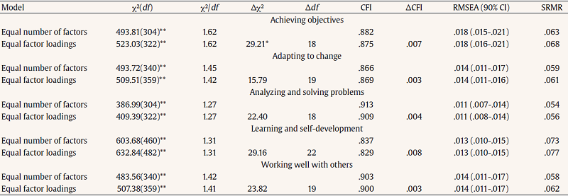 We then investigated model fit for this baseline model per region. For the SJTs of“achieving objectives” as well as“analyzing and solving problems”, model fit for the baseline model within each region were at least acceptable. For the three remaining SJTs, the CFI value for the model fit within Latin America fell below the limit of acceptable model fit. Previous studies that investigated the factor structure of SJTs frequently found similar patterns and usually failed to find good model fit (with acceptable CFI values). To analyze measurement invariance, these studies then used the best fitting model as baseline model for the multigroup confirmatory factor analyses (e.g., Krumm et al., 2015; Lievens, Sackett, Dahlke, Oostrom, & De Soete, in press). In line with this approach, we kept the one-factor model as baseline model for our measurement invariance analyses.