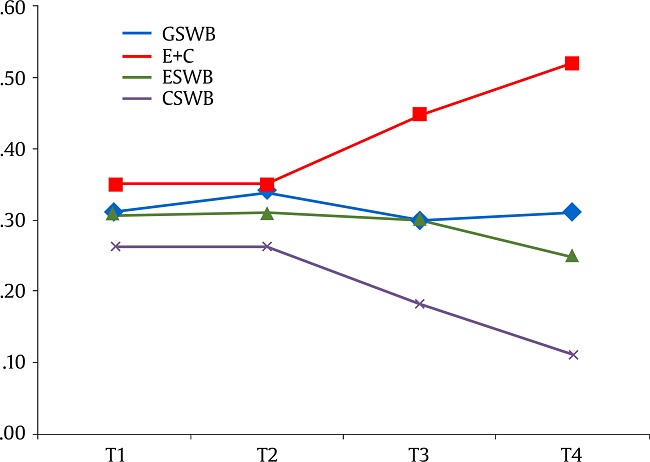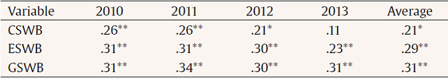 ESWB correlated significantly with job performance across the four years, giving full support to Hypothesis 1 and agreeing with the finding by Cropanzano and Wright (1999) that the emotional component predicted job performance over a period of four years. With regard to the relationship between CSWB and job performance, the measure taken in 2010 predicted job performance significantly in 2010, 2011, and 2012, but the correlation was not significant in 2013. This result partially supports Hypothesis 1. Finally, the GSWB correlated significantly with job performance during the first three years but not in the fourth year. As a whole, these findings indicate that GSWB, CSWB, and ESWB maintained their predictive capacity for at least the first three years.