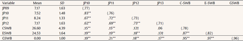 In Table 2, we report the descriptive statistics (mean and standard deviation) and observed correlations (Pearson’s r), among all the study variables. As can be seen, the cognitive and emotional components of SWB correlated highly (r = .87). These results agree with previous findings, which showed that the cognitive and emotional components of SWB are highly correlated. Based on this correlation and for theoretical reasons, a GSWB compound was created on the basis of a principal component analysis.