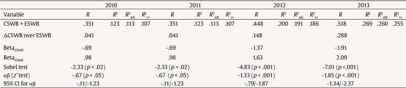 In Table 4 it can be seen that the Sobel test and the z’ test are statistically significant for the four years and also the 95% confidence intervals did not include a zero value. In other words, in the four cases the positive effect of ESWB on job performance was significantly stronger when CSWB was included in the regression equation. Simultaneously, the negative effect of CSWB was significantly stronger when ESWB was in the equation.