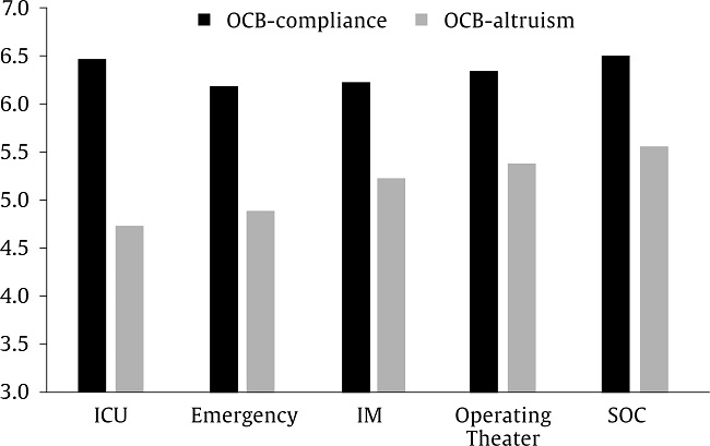 First, the scores obtained for contextual performance in each hospital unit were compared. The analysis of variance showed absence of statistically significant differences in the compliance dimension, F(4,216) = 1.54, p = .19. In the altruism dimension, the result of the ANOVA was statistically significant, F(4,216) = 3.39, p = .01.