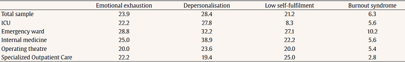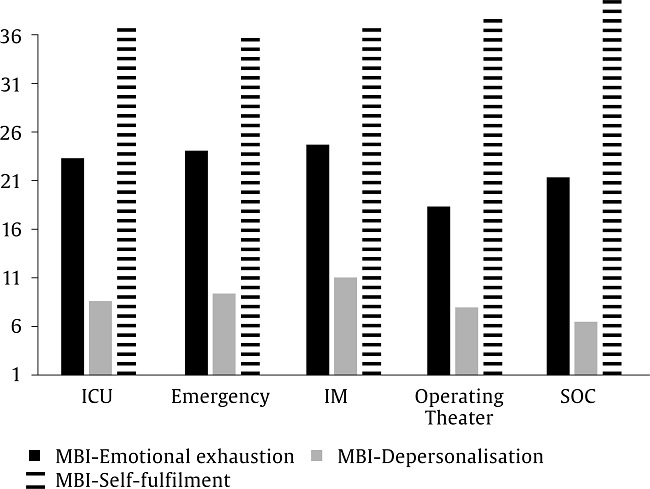 In response to these scores, the frequency of high levels of emotional exhaustion and depersonalisation and of low levels of self-fulfilment was calculated in the total sample, as well as the frequency of these dimensions within each hospital unit. The results are shown in Table 3. Of the total sample, 23.9% had high levels of emotional exhaustion, 28.4% had high levels of depersonalisation, and 21.2% had low levels of self-fulfilment.