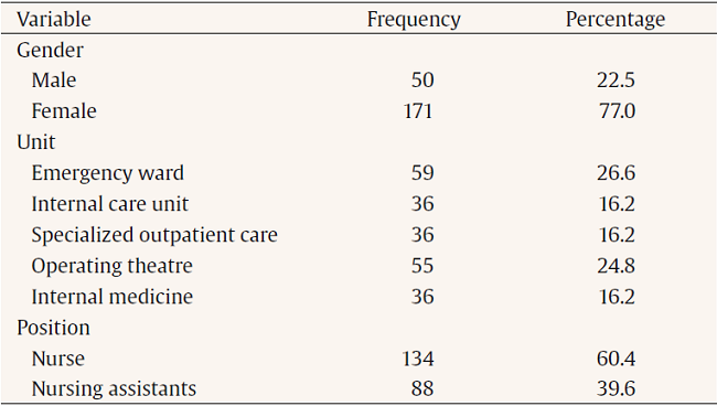 As an inclusion criterion, participants had to have worked in one of the aforementioned units for at least three months. After applying the inclusion criteria, 222 healthcare professionals participated in the study (43.61% of the nursing staff in the selected hospital units). Of the sample, 60.4% were nurses and 39.6% were nursing assistants. Mean age of participants was 38.58 years old (SD = 10.67). A total of 77% of the sample were women. The demographic characteristics of the sample are shown in Table 1.