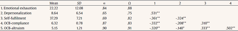 Table 2 shows the average scores and standard deviations obtained in contextual performance (global score), compliance, altruism, and burnout (emotional exhaustion, depersonalisation, and self-fulfilment) dimensions, for the total sample. Table 2 also shows the reliability scores (alpha and omega) for each dimension, and correlations between dimensions.