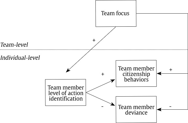 Our theory development suggests that the respective relationships between team focus and discretionary team member behaviors will be mediated by team members level of action identification (Vallacher & Wegner, 1985; 1987). Team members should engage in higher levels of citizenship and lower levels of deviance because teams outcome focus is more salient than process focus, this saliency leads team members to identify their actions at higher, more abstract levels, and this higher action identification leads team members to engage in thought processes that make long-term interests more salient than short-term interests. This theorizing corresponds with prior empirical work that has found action identification to mediate the relationships between team focus and various task outcomes (e.g., Aggarwal & Woolley, 2013; Woolley, 2009a, 2009b).