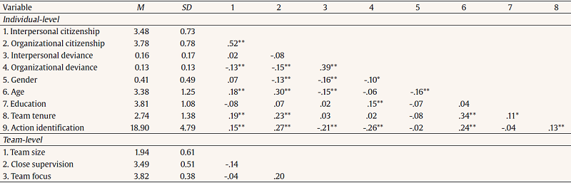 We used hierarchical linear modeling to test our hypotheses because hierarchical linear modeling controls for the non-independence of observations that is found in nested data (Raudenbush & Bryk, 2002; Snijders & Bosker 2012). We used a two-level hierarchical linear model of team members nested within teams, rather than a three-level hierarchical linear model of team members nested within teams nested within organizations, because our sample size of 15 organizations is not a sufficiently large enough sample size in a hierarchical linear model (González-Romá & Hernández, 2017; Snijders & Bosker, 2012). In our sample, a null model (equivalent to a one-way random-effects ANOVA model) suggested that there were significant differences between teams in terms of interpersonal citizenship, p < .01, organizational citizenship, p < .01, organizational deviance, p = .04, and action identification, p < .01, but no significant differences in terms of interpersonal deviance, p = .21. These results largely support our use of hierarchical linear modeling (Raudenbush & Bryk, 2002; Snijders & Bosker 2012).