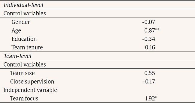 In Table 2, we find that team focus is positively and significantly associated with a team members level of action identification, = 1.92, SE = 0.88, p = .03, supporting hypothesis 1. This suggests that teams who are more focused influence members of the team to have a higher level of action identification.