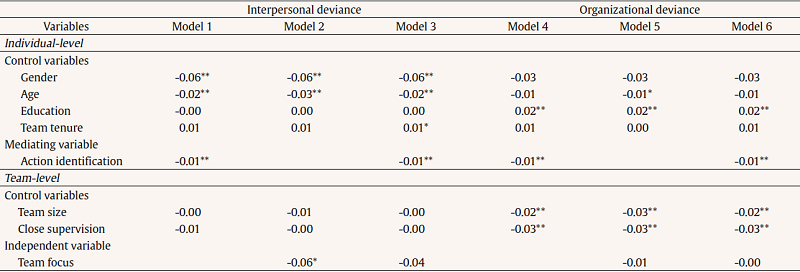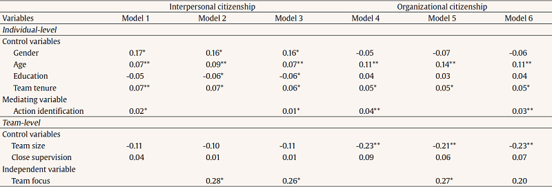Table 1 presents the individual- and team-level descriptive statistics and correlations. Table 2 presents the relationship between team focus and action identification. Table 3 presents the relation-ships between team focus, action identification, and team member citizenship, while Table 4 presents the relationships between team focus, action identification, and team member deviance.