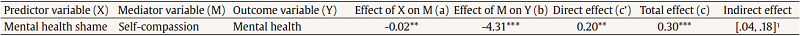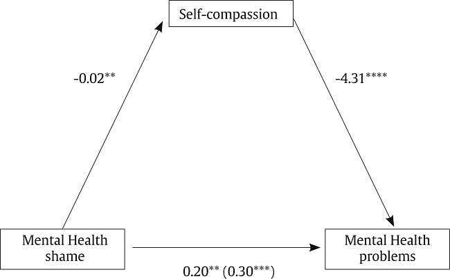 Finally, path analysis was conducted, using model 4 in the Process macro (parallel mediation model; Hayes, 2012), in order to examine whether self-compassion (mediator variable) mediated the relationship between mental health shame (predictor variable) and mental health problems (outcome variable).