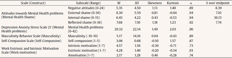 The rates of construction workers who scored above the midpoint in each type of mental health shame were low: 8.39% for negative attitudes, 7.10% for external shame, 36.13% for internal shame, and 7.74% for reflected shame. The mean score of mental health problems (29.32) was in the normal level, yet close to the mild level (30; Lovibond & Lovibond, 1995). Though comparable data available were limited, the mean score of the masculinity (5.17 of -10 to 10) was significantly higher than 394 American psychology students (290 females and 104 males; M = -.85, SD = 4.86, p < .0001; Snell, 1989), and not significantly different from 69 American male veterans (M = 8.33, SD = 10.86, p = .10; Garcia, Finley, Lorber, & Jakupcak, 2011) through t-tests. The mean score of self-compassion (3.08 of 1-5) was not significantly different from 328 individuals (181 females and 147 males; Mage = 57, SDage = 15.2 years) in the general public (M = 3.07, SD =. 63, p = .87; López, Sanderman, Ranchor, & Schroevers, 2018). The mean scores of intrinsic (4.57 of 1-7, SD = 1.56), extrinsic motivation (4.28 of 1-7, SD = 1.40), and amotivation (2.17 of 1-7, SD = 1.28) were significantly lower than 103 hospitality workers (56 females and 47 males; Mage = 28.2, SDage = 8.6 years; intrinsic M = 5.79, SD =. 95, p < .0001; extrinsic M = 5.70, SD = .99 , p < .0001; amotivation M = 5.25, SD =1.82 , p < .0001; Kotera, Adhicari et al., 2018).