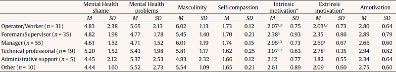 Further, a one-way multivariate analysis of variance (MANOVA) was conducted to appraise whether there were differences in mental health shame, mental health problems, masculinity, self-compassion, and motivation between different job roles (Table 2).