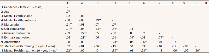 This study investigated the relationships between mental health shame, mental health problems, masculinity, self-compassion, and motivation. The rates of construction workers who scored over the midpoint were low, the highest being 36.13% for internal shame. Mental health shame, mental health problems, masculinity, self-compassion, and motivation were adequately related to each other (H1a, c, e-g), except for mental health shame and masculinity (H1b), and mental health shame and motivation (H1d). Finally, self-compassion partially mediated the relationship between mental health shame and mental health problems (H2). Each finding is discussed in turn below.