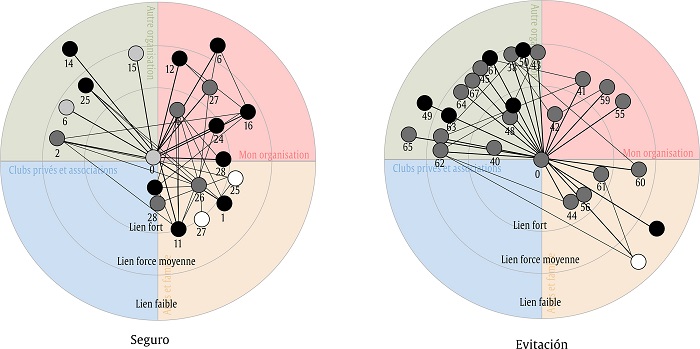 The second group has less strong ties but more prestige ties, in a less constrained network, with a larger effective size (n = 23, 38.33%). That is to say, it seems to correspond to a type of personal networks that maximizes the instrumental social capital (with prestige ties, less redundant), at the expense of less strong or less deep relations. In this case they stand out for scoring higher in avoidance style.