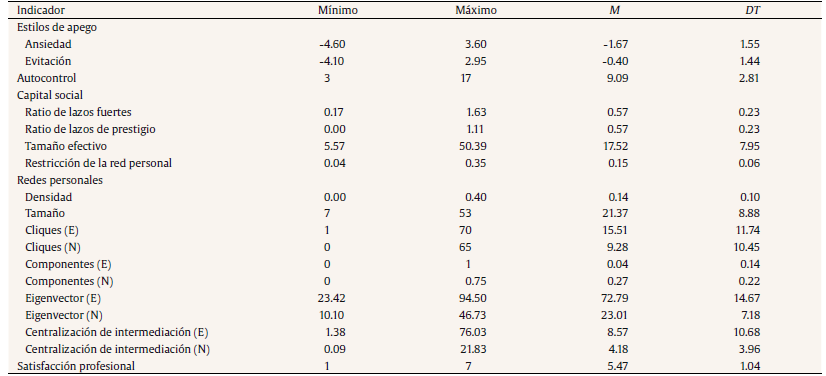 Descriptive analysis and correlations.Table 1 shows the mean and the standard deviation, and in Table 2 the correlations of the variables studied are presented. The size of managers personal networks shows a wide range of variation, ranging from 7 to 53 contacts (M = 21.36, DT = 8.87). Consequently, the different structural indicators obtained have also a high standard deviation. Managers tend to score high in secure attachment (compared to the other styles), obtain average scores in self-monitoring (M = 9.09, SD = 2.81), and declared themselves moderately satisfied with their professional career (M = 5.47, SD = 1.03). In general, they perceive that they still have opportunities for improvement and progress in their career.