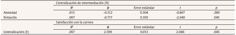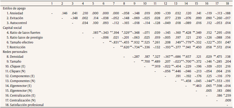 Por lo que respecta a los estilos de apego, la dimensión evitación mantiene una relación inversa significativa con la centralización de intermediación de la red personal (r = -.260, p < .05) (sin tomar en consideración los lazos de ego). La satisfacción con la carrera solo guarda una relación estadísticamente significativa con uno de los indicadores de centralización de la red personal [betweenness centralization] (r = .259, p < .05), mientras que el nivel de autocontrol no mostró asociaciones significativas con los indicadores de capital social ni de redes personales (Tabla 2).