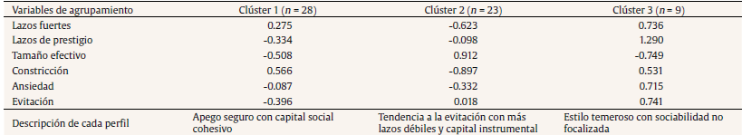 The third conglomerate corresponds to a small number of individuals with the highest scores in all dimensions (n = 9, 15%). It is a collective at the end of the different indicators of sociability, which also scores higher in anxiety and avoidance.