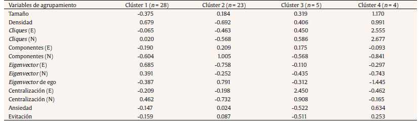 Para confirmar esta clasificación, elaboramos un segundo análisis de conglomerados con los indicadores de redes personales y estilo de apego. Se aplicó el mismo procedimiento que en la clasificación anterior. En este caso obtuvimos una solución de cuatro conglomerados (Bouchard, 2019), aunque con una distribución bastante parecida a la anterior. Si nos centramos en los dos grupos más numerosos, vemos que uno de los grupos tiene redes personales comparativamente más amplias, menos densas, con mayor centralización [betweenness centralization] y menor número de cliques (n = 23, 38.33%). En comparación, los individuos de apego más seguro muestran redes más reducidas e integradas (n = 28, 46.67%). Por su parte, el grupo más reducido, de 9 individuos en la clasificación anterior, se divide en dos subgrupos, con puntuaciones más extremas que el resto de entrevistados (Tabla 5).