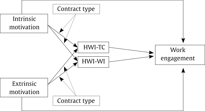 The aim of the current paper was to shed light on (1) HWI as a mediational mechanism between intrinsic/extrinsic motivation (as predictors) and WE (as an outcome) (see Snir & Harpaz, 2015, p. 6), and (2) the moderation effect of employment contract type on the association between motivation and HWI.