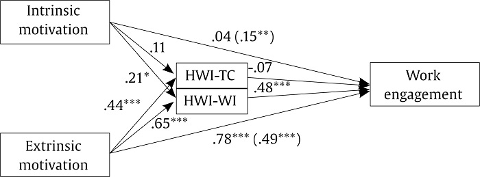 These findings highlight that HWI-TC is not a mediator between motivation and WE, but its counterpart, HWI-WI, does play the role of a mediator. These findings indicate that a heavy investment of effort, as hypothesized, is a partial mediator in the relationship between extrinsic/intrinsic motivation and work engagement.