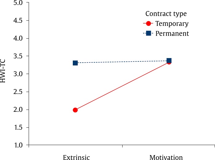 As shown in Figure 3, the association between extrinsic motivation and HWI-TC is stronger for employees working on a temporary-term contract, than those working on permanent type of contract.