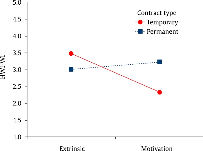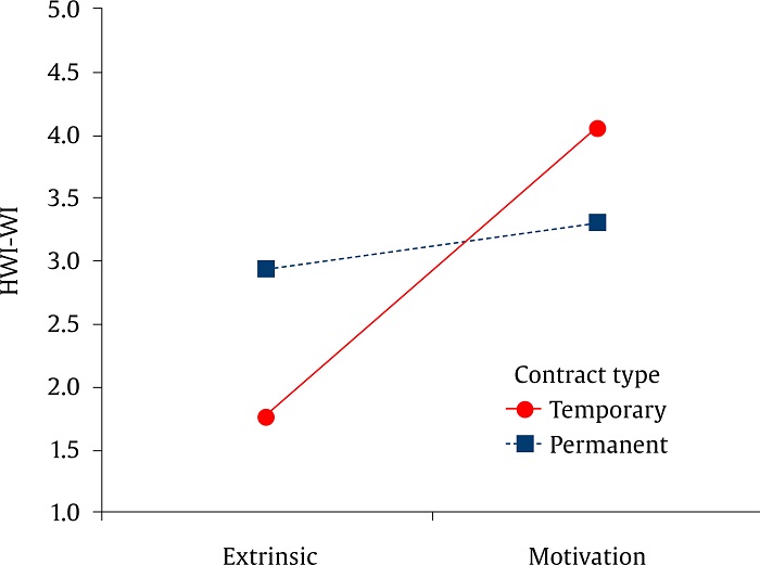 As shown in Figure 5, the association between extrinsic motivation and HWI-WI is stronger for employees working on a temporary-term contract than those working on a permanent type of contract.