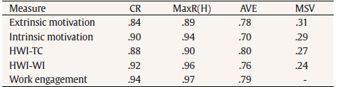 H4: Extrinsic motivation correlates positively with both HWI-TC for temporary engineering employees (r = .85***) and for permanent engineering employees (r = .36***) and HWI-WI for temporary/student engineering employees (r = .73***) and for permanent/full-time engineering employees (r = .38***). In order to assess whether the difference in correlation strength between extrinsic motivation-HWI-TC and extrinsic motivation-HWI-WI is statistically significant, we calculated Mengs Z (see Meng et al., 1992) for both groups (i.e., permanent and temporary) separately. While the difference was significant in the temporary engineering employees group (Z = 2.54, p = .006), it was non-significant in the permanent engineering employees group (Z = -0.24, p = .404).