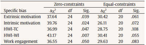 Harmans one-factor test (Podsakoff, MacKenzie, Lee, & Podsakoff, 2003) was used to assess the degree to which inter-correlations among the variables might be an artifact of common method variance (i.e., all items loaded on one single-factor). The first general factor that emerged from the analysis accounted only for 35.19% of the explained variance. While this result does not rule out completely the possibility of same-source bias (CMV), according to Podsakoff et al. (2003) less than 50% of the explained variance accounted for by the first emerging factor indicates that CMB is an unlikely explanation of our investigation findings. However, as this test does not provide the ultimate evidence, we employed one of the most powerful contemporary methods to explore common method variance: zero-constrains specific bias approach conceived by Archimi, Reynaud, Yasin, and Bhatti, (2018). The results displayed in Table 2 show that a measuring bias is present in our study, though it is evenly distributed (non-random), and hence it does not confound our results.