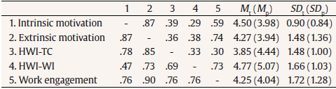 H3: Intrinsic motivation correlates positively with both HWI-TC for temporary engineering employees (r = .78***) and for permanent engineering employees (r = .39***) and HWI-WI for temporary engineering employees (r = .47***) and for permanent engineering employees (r = .29***). In order to assess whether the difference in correlation strength between intrinsic motivation-HWI-TC and intrinsic motivation-HWI-WI is statistically significant, we calculated Mengs Z (see Meng, Rosenthal, & Rubin, 1992) for both groups (i.e., permanent and temporary) separately. While the difference was significant in the temporary engineering employees group (Z = 4.74, p = .000), it was non-significant in the permanent engineering employees group (Z = 1.17, p = .116).