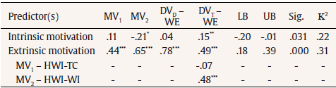 Moreover, an examination of the effect size, indicated by the regression coefficients and the significance levels, indicates that these values are higher for the path Extrinsic MotivationHWI-WIWE than for the path Intrinsic MotivationHWI-WIWE. This result demonstrates that the mediation of HWI-WI is stronger with extrinsic motivation, than with intrinsic motivation (see also Table 4).