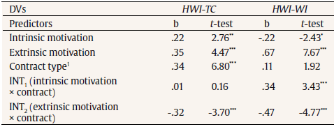 The hypothesized moderations of contract type (temporary vs. permanent) on the relationships between intrinsic/extrinsic motivation and HWI (HWI-TC and HWI-WI) were mostly supported by our data (see Table 5). Contract type was a significant moderator in the following links: (1) Extrinsic MotivationHWI-TC; (2) Intrinsic MotivationHWI-WI; and (3) Extrinsic MotivationHWI-WI; but not in the Intrinsic MotivationHWI-TC relationship.