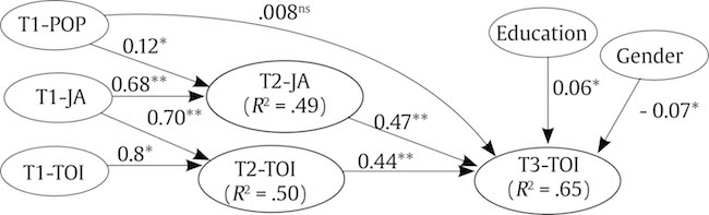 Mediation test (hypothesis 1). Figure 2 shows the estimated 3 wave autoregressive mediation model. This model has been constructed based on the procedures for longitudinal mediation explained in Cole & Maxwell (2003) and is analogous to a two unit time lag model explained in Maxwell et al. (2011, p. 822). In this model, the indirect effect of POP on TOI takes two units of time, one for POP to affect JA and another for JA to affect TOI. According to Maxwell et al. (2011), “if the indirect effect takes two units of time, an argument could be made for expecting the direct effect to take two units as well”. This argument justifies a 3 wave time-lagged model where the direct effect of independent variable on dependent variable takes two units of time ( Maxwell et al., 2011).