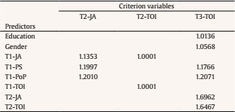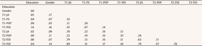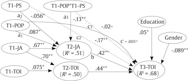 Following the above mentioned procedures, the indirect effect and its significance were tested by using product of coefficients and bootstrapping procedures ( Hair et al., 2015; Preacher, Rucker, & Hayes, 2007). These procedures are consistent with Cole and Maxwell (2003) who suggested that, for mediation to exist, the necessary (as well as sufficient) condition is that the indirect effect—the product of the coefficients of paths from time 1 predictor (T1-POP) to time 2 mediator (T2-JA) to time 3 dependent variable (T3-TOI)—must be non zero. In our model, the indirect effect was .056 [0.12*0.47]. Bootstrapping with 5,000 samples yielded a t-value = 2.36, which represents a significant indirect effect at p < .05.