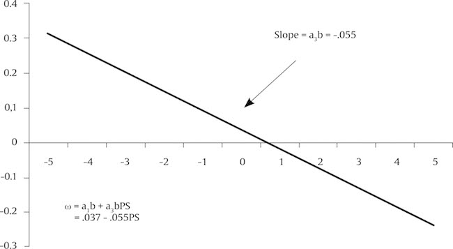 A visual representation of this linear function can be obtained by using the values of intercept and slope in above equation, at different values of the moderator. In this study, the intercept is .037 (.087 * .42) and slope is -.055. The linear function in Figure 5 was obtained by using arbitrary values of moderator from – 5 to 5. The negative slope of the line (or the index of moderated mediation) indicates that the indirect effect of perceptions of politics on turnover intentions through job anxiety seems to decrease with increasing political skills.