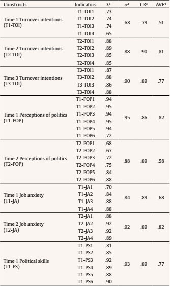 Factor loadings of individual items and average variance extracted (AVE), composite reliability, and Cronbach’s α for the latent variables have been shown in Table 2. Overall, these values indicate that our data are valid and reliable at item and construct level. One item of turnover intentions (TOI-5) was deleted from analysis because of its factor loading being below .40 in all waves. Items T1-TOI4, T2POP1, and T2-POP2 were retained with their respective constructs despite their factor loadings being below .708. According to Hair et al. (2014, p. 107), “indicators with outer loadings between .40 and .70 should be considered for removal only if the deletion leads to an increase in composite reliability and AVE above the suggested threshold value”. We performed this operation, and deleting T1-TOI4, T2POP1, and T2-POP2 did not cause any increase in composite reliability and AVE. So, these items were retained as indicators of their respective constructs.