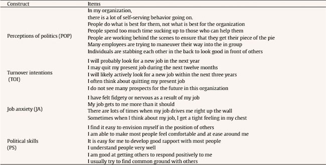 Data were collected by using survey instruments already used in existing research (see Appendix). The instruments were used in their original form and language (i.e., English language). The target population had a sufficient level of education to understand the questionnaire. Any issues in understanding the questionnaire were solved by the researchers in follow-up visits. For all the questionnaires, a five point Likert scale was used which ranged from 1 = strongly disagree to 5 = strongly agree. Perceptions of organizational politics were measured by a 6-item scale used in Hochwarter, Kacmar, Perrewe, and Johnson (2003). A six-item scale was used to measure political skills ( Ahearn, Ferris, Hochwarter, Douglas, & Ammeter, 2004). Dysvik and Kuvaas’ (2008) five item scale was used to measure employee turnover intentions. Job anxiety was measured by using four items from Parker and DeCotiis’ (1983) 13-item scale developed to measure two dimensions of job stress: ‘job-related feelings of anxiety’ (5 items) and ‘feelings of being under substantial time pressure’ (8 items). This study used four out of five anxiety related items. Insights from previous studies published in well reputed journals suggest that the four items selected for this study best capture the notion of job anxiety ( Glazer & Beehr, 2005; Glazer & Kruse, 2008; Vanderpool & Way, 2013). Reliability results of all the questionnaires have been reported in Table 2.