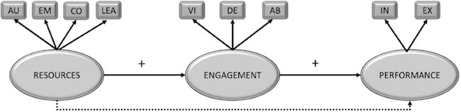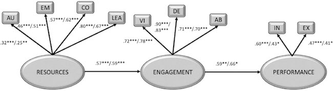 Table 2 shows the results of the SEM models of the relationships between job resources, work engagement, and performance. The model has one exogenous variable (resources) and two endogenous variables (engagement, with its dimensions of vigor, dedication, and absorption, and performance). All the scales were treated as latent variables. Job resources had four indicators, engagement had three, and performance had two.