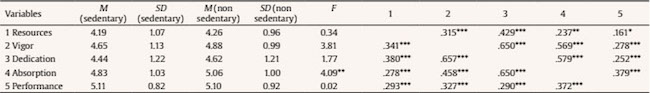 Table 1 shows the means, standard deviations, and inter-correlations among the study variables in the two samples. The correlation analyses reveal that the variables are positively related in the two samples (sedentary r mean = .40, non-sedentary r mean = .38) (see Table 1). Furthermore, the results show that all the scales meet the reliability criterion proposed by the scientific research ( Nunnally & Bernstein, 1994): resources ( = .81), engagement ( = .81), and performance ( r = .21, p <.001).