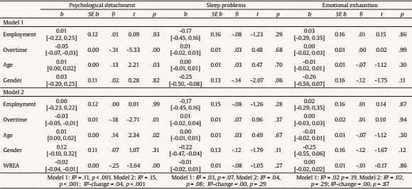 Hypothesis 1b: Hypothesis 1b stated that the extent of WREA is positively associated with sleep problems over and beyond the influence of overtime and socio-demographics. Contrary to our expectations, the overall regression model ( Table 2) with WREA as predictor was nonsignificant ( p = .09).