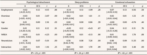 Hypothesis 2a: Hypothesis 2a stated that the relationship between WREA and psychological detachment from work is moderated by neuroticism such that people higher in neuroticism will have more problems detaching from work. The overall regression model ( Table 3) was significant ( p < .001) and explained 23% of the variance. However, contrary to our hypothesis, the interaction term was nonsignificant ( b = -0.007 [0.02, 0.01], p = .24).