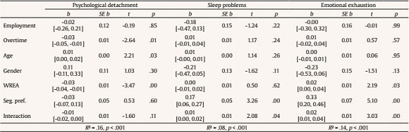 Hypothesis 3a: We assumed that the relationship between WREA and psychological detachment from work would be moderated by segmentation preferences such that people with stronger segmentation preferences have more problems detaching from work. The overall regression model ( Table 4) was significant ( p < .001) and explained 16% of the total variance. The interaction term, however, was non-significant ( b = -0.009 [0.02, 0.00], p =.11).