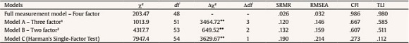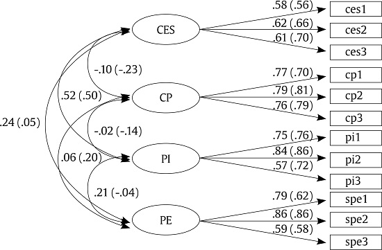 We first conducted confirmatory factor analysis (CFA) to confirm the distinctness of the studys measures in the samples. Besides the measurement model, which include the four correlated factors proposed in the study CES, PI, CP and PE a three-factor (including CES and PI into a single factor) and two-factor (combining CAE, PI, and CP into a single factor) models were also tested. Among alternative models, the one-factor model where all variables were loaded on a single latent factor allowed for evaluating potential common method variance induced by the use of single informants by using Harmans test ( Podsakoff et al. , 2003). The basic assumption of Harmans one-factor test is that if a substantial amount of common method variance is present, either a single factor will emerge from factor analysis or one general factor will account for the majority of covariance among measures, with all items loading on that single factor. In addition, we assessed measurement invariance of the scales used in the two samples. Literature has underscored the importance of establishing measurement equivalence for meaningful and reliable interpretation of group differences (such as mean scores and regression coefficient), even for groups from within the same culture ( Steinmetz et al., 2009; Vandenberg & Lance, 2000). In measurement invariance analysis, we progressively subject parameters (factor loading and indicator intercepts) to equality constraints, with each successive step retaining constraints from previous step. With each step, a change in CFI (DCFI) of less than or equal to .01 indicates invariance ( Cheung & Rensvold, 2002). As this study involve mainly comparison of the regression coefficient, establishing invariance of factor loading and indicator intercepts suffice, and we will not proceed further to test for invariance of residual variances, structural covariance, and structural means.