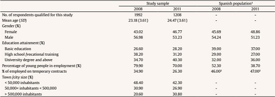 The two cross-sectional data waves for this study were obtained from the Spanish Observatory of Young Peoples Transition into the Labor Market [ Observatorio de Inserción Laboral de Los Jóvenes] ( Fundación Bancaja e IVIE, 2012). Data were collected by the observatory in 2008 and 2011, from May through June. Respondents were young people aged between 16 to 30 years who were entering the labor market in the previous five years at the time of the survey, i.e., seeking or having found their first job between 2003 and 2008 and between 2006 and 2011, respectively. The sampling distribution was formulated according to the percentage of young people in each region (except Ceuta, Melilla, Canary Islands, and Balearic Island) in the national total (census by the National Statistics Institute [ Instituto Nacional de Estadística]). Overall, respondents were from 34 cities and small towns from 17 Spanish provinces, and were considered representative of both urban and non-urban areas in Spain.