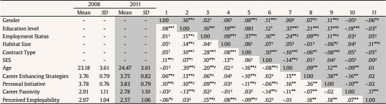 Perceived employability (PE). Perceptions about ones possibilities in the current labor market were assessed using three items from the Employment Outlook scale in the Career Exploration Survey ( Stumpf et al., 1983). Items were: In the current labor market, it seems possible to find work for which I am prepared or have experience, In the current labor market, it is possible to find a job in a firm of my choice, and In the present labor market situation, I could find a job with the time dedication I prefer. Scale reliability Chronbachs alphas (a) for 2008 and 2011 were .79 and .72 respectively.
